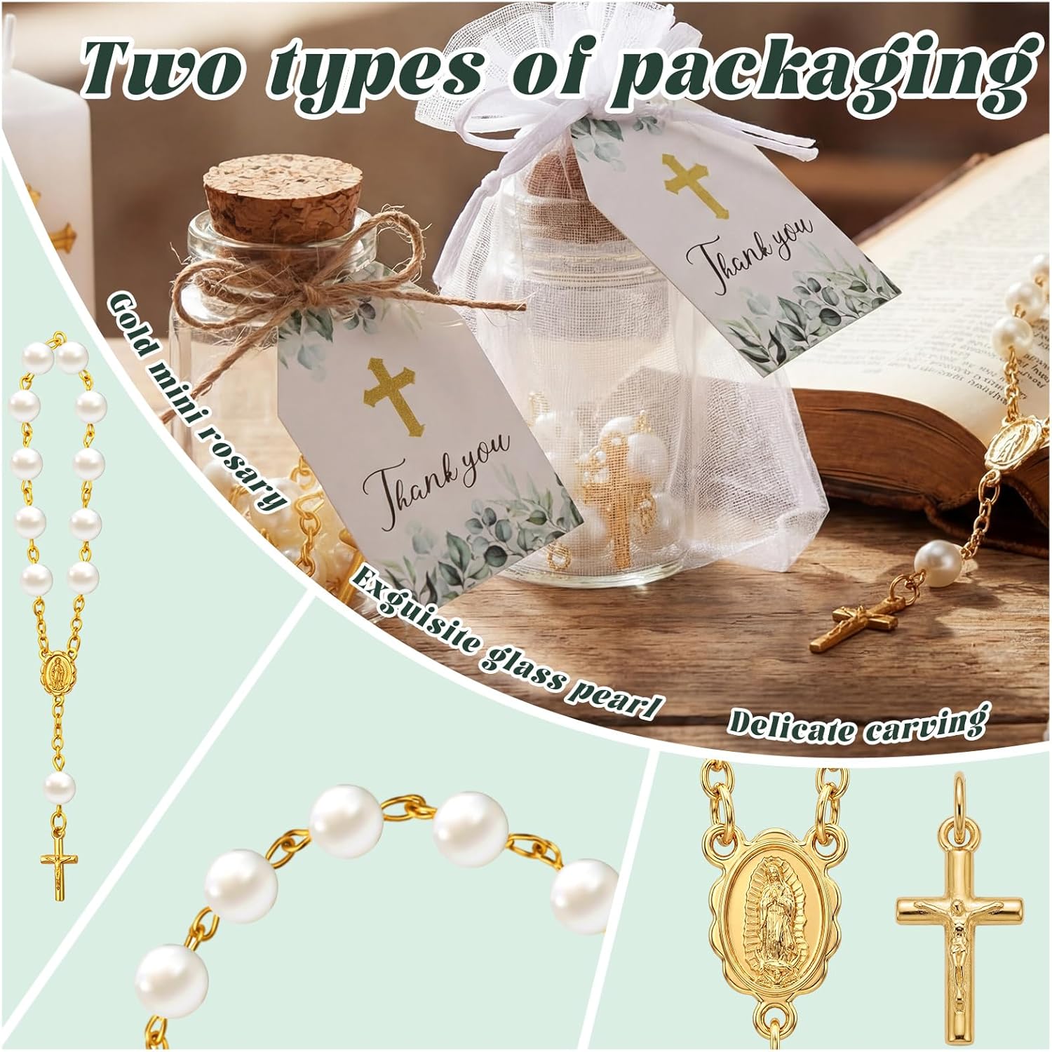 Features: Simple and Rewarding DIY Assembly: The kit invites you to add a personal touch through easy, satisfying assembly. The process of placing the rosary into the bottle and tucking it alongside a handwritten card into the organza bag is simple yet allows you to imbue each favor with care and intention, creating a truly handmade feel. Personalizable with Your Heartfelt Message: The included thank-you cards make this package special. This allows you to transform a standard favor into a unique gift by handwriting a personalized blessing, a favorite Bible verse, the guest's name, or a note of thanks. This final touch adds profound emotional value and creates a lasting connection with your guests. Specifications: Material: acrylic, metal, organza, glass, quality paper Color: multicolor Size: The mini rosary: approx. 4.5 inches/11.5 cm The organza bags: approx. 2.8 x 3.6 inches/7 x 9 cm The glass bottle: approx. 1.2 x 2.2 inches/3 x 5.5 cm The thank you cards: approx. 1.4 x 1 inches/3.5 x 2.5 cm Package includes: 25 x Mini rosaries 25 x Organza bags 25 x Glass bottles 25 x Thank you cards Bundle of twine Notes: Manual measurement, please allow slight errors on size. The color may exist a slight difference due to different screen displays