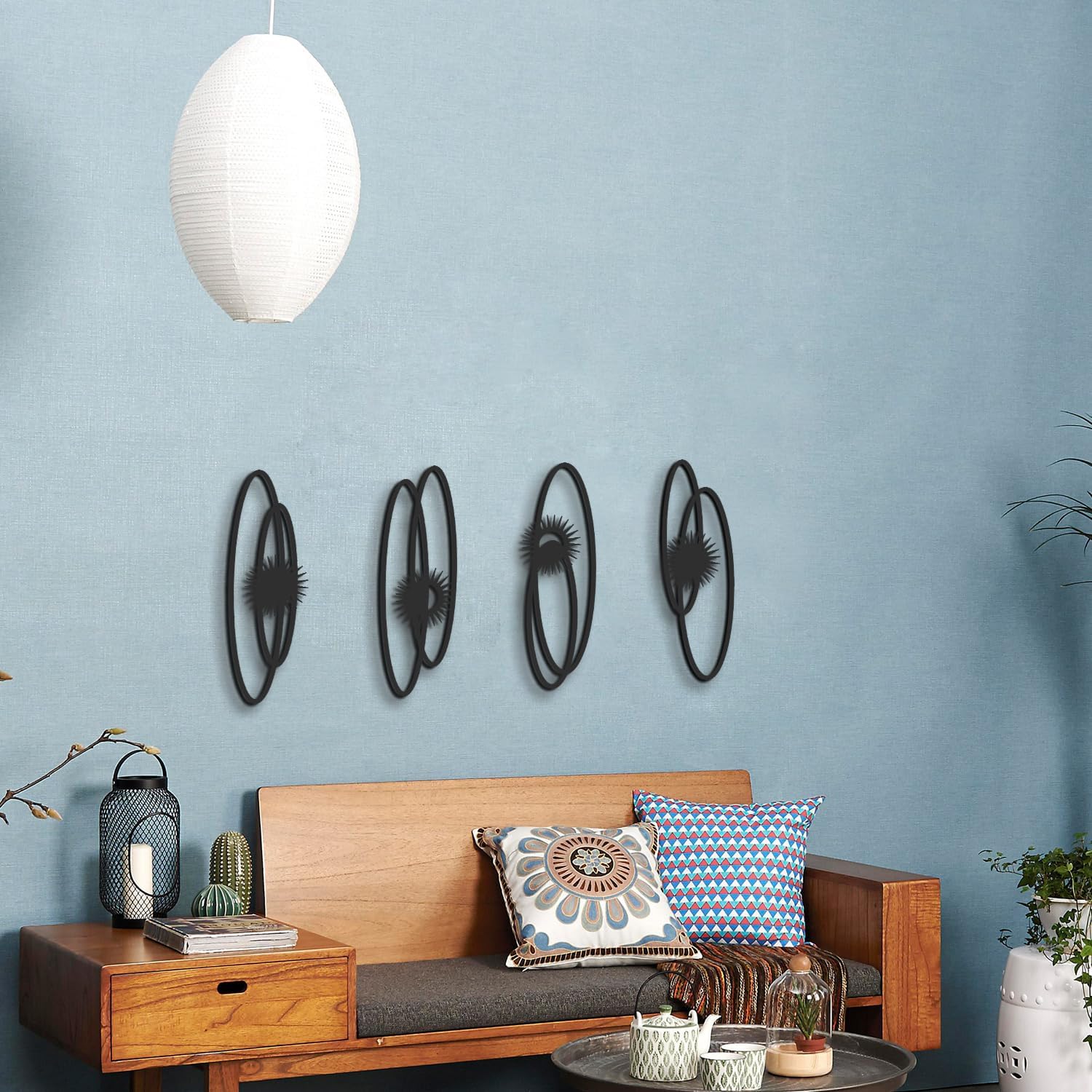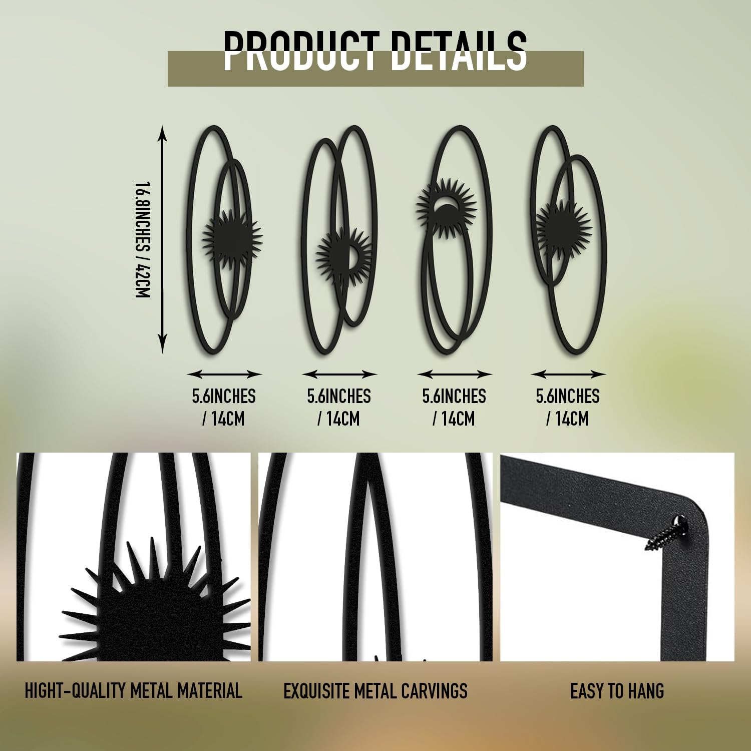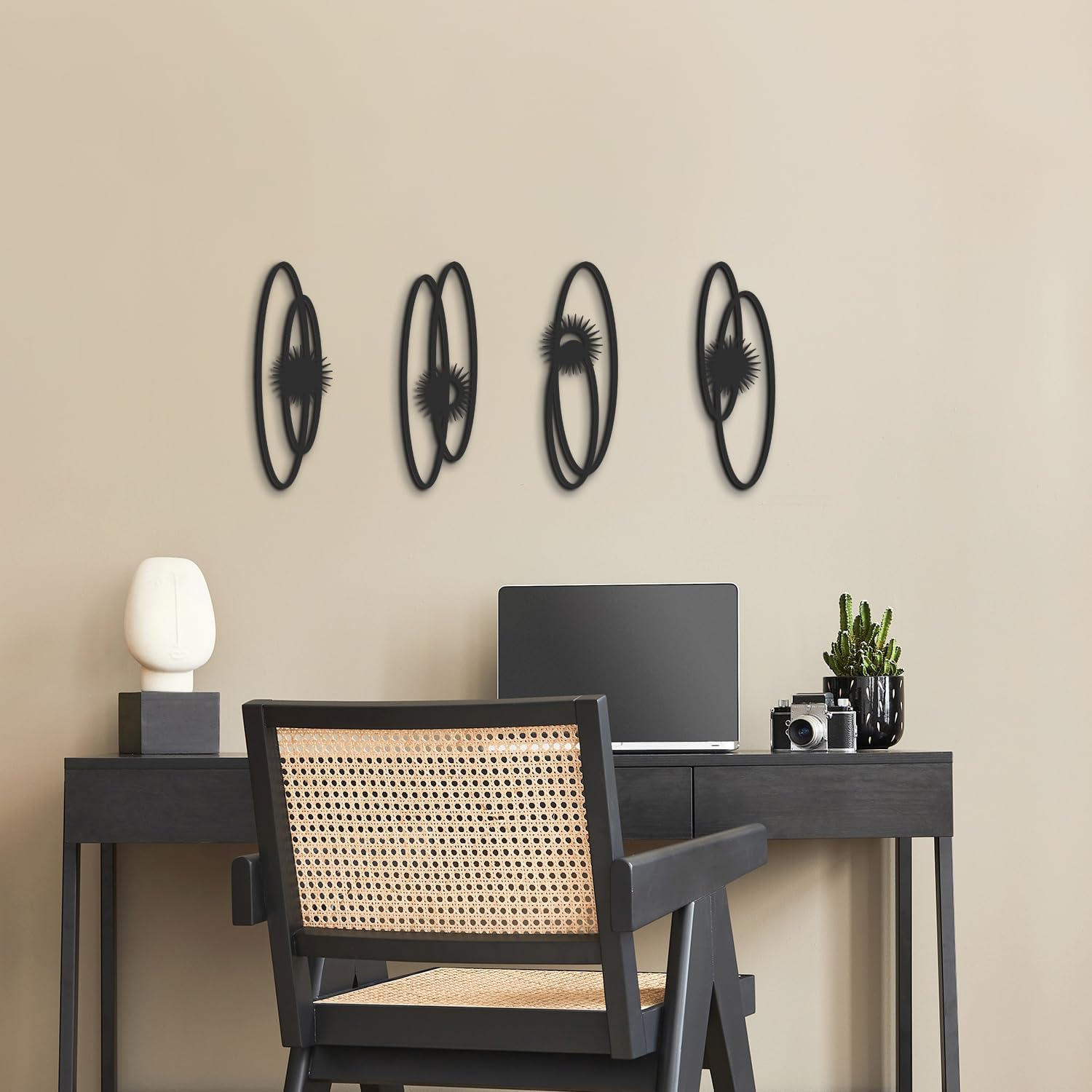 Transform your living space with this striking set of 4 black metal wall sculptures. Each piece measures 16.5 x 5.5 inches and features an elegant single-line design with bold sun motifs, creating a sophisticated vertical display. The minimalist geometric patterns combine smooth curves with radiant bursts, offering a perfect balance of simplicity and visual interest. These 3D textured sculptures add depth and dimension to any wall, making them ideal for contemporary home décor. The versatile black finish complements any color scheme, while the vertical orientation makes them perfect for narrow wall spaces in living rooms, bedrooms, bathrooms, or study areas. Each piece is crafted from durable metal, ensuring long-lasting beauty. The modern design creates an eye-catching focal point that elevates your space with artistic flair. Easy to arrange in various configurations, these sculptures allow you to create your own unique wall composition.