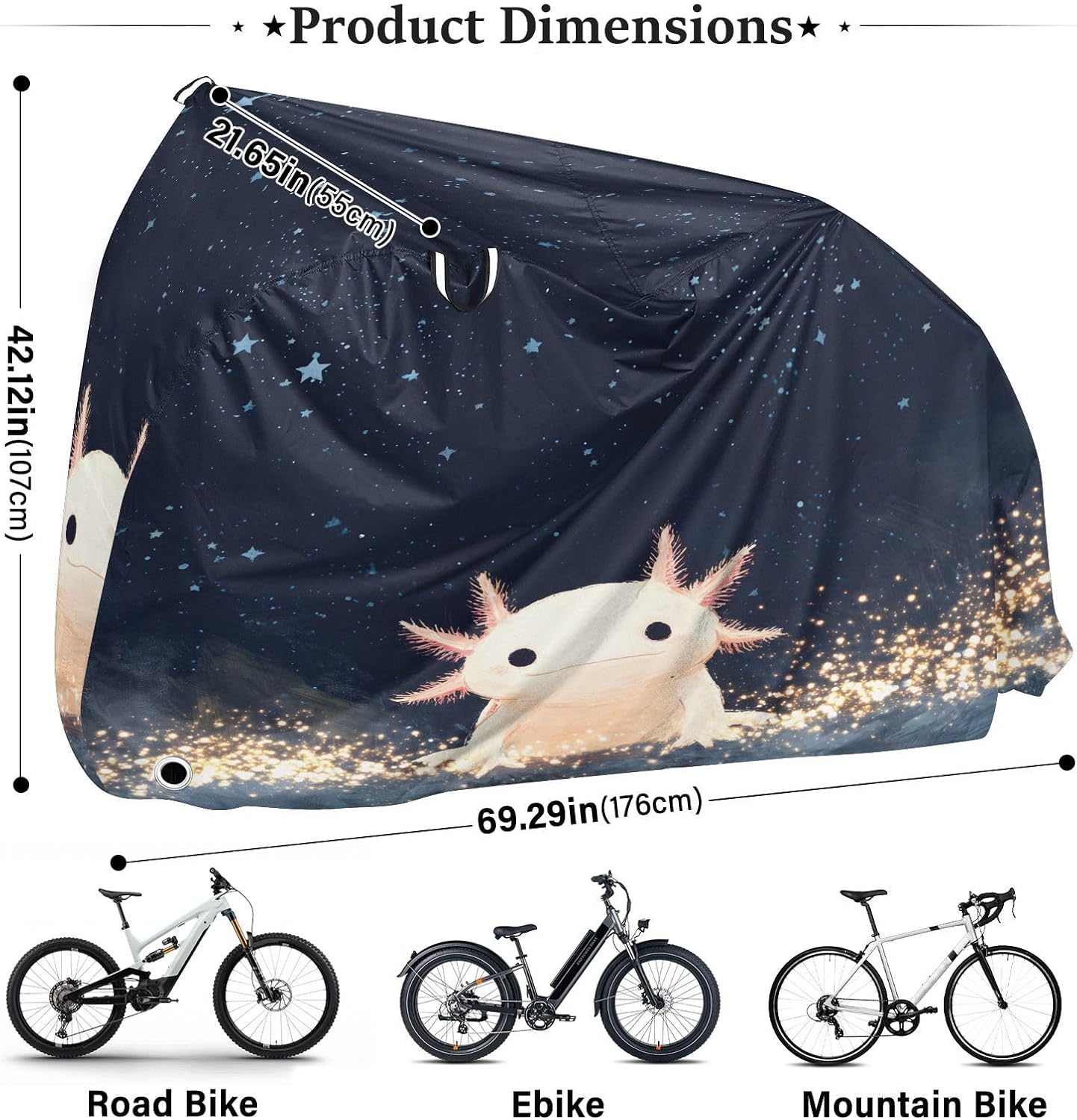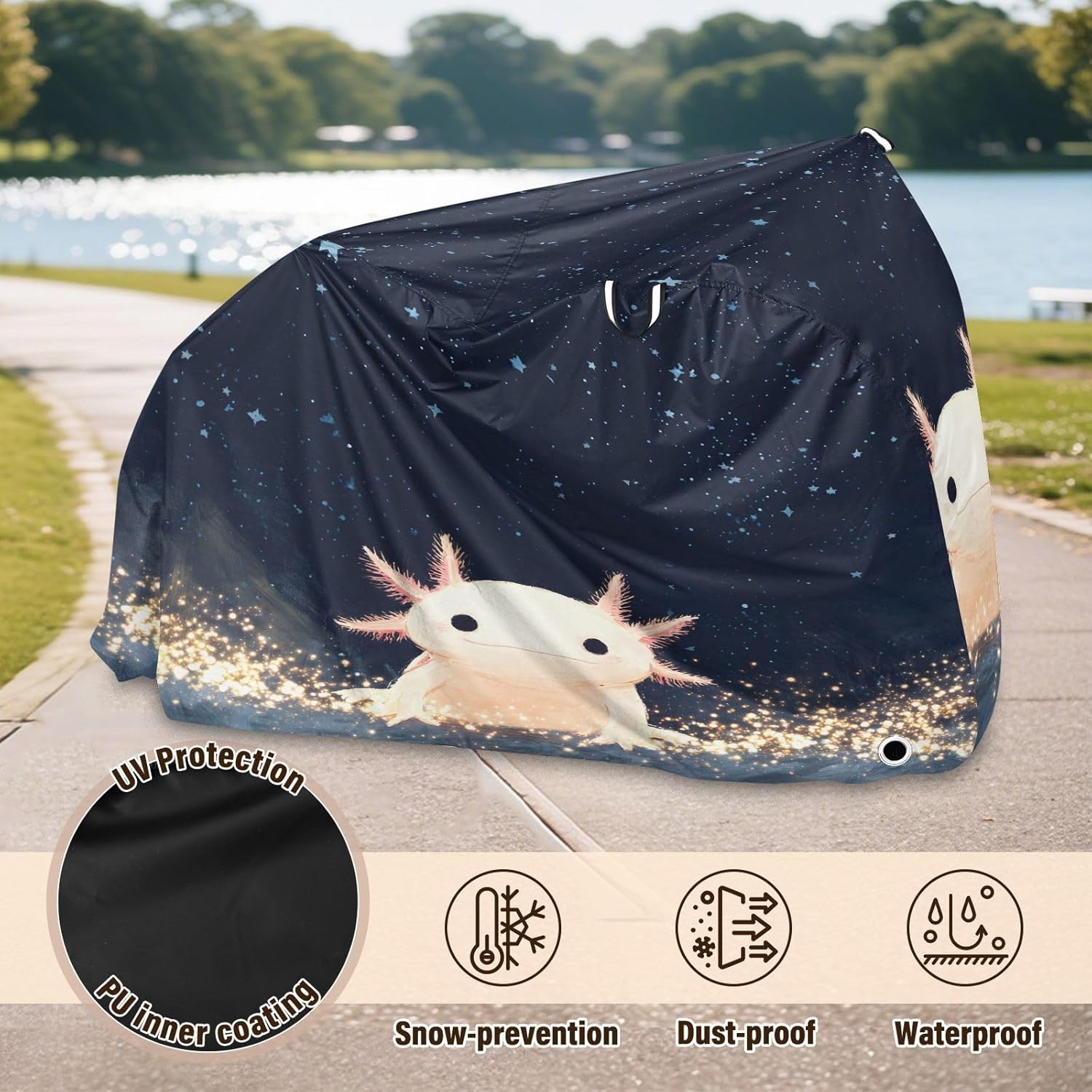 Protect your bicycle in style with our premium bike tarp, engineered for maximum defense against harsh elements. Unlike basic covers, we use specially engineered umbrella waterproof fabric - the same advanced material used in high-end rain umbrellas - delivering superior performance with unique visual appeal. Sun & Heat Defense Our fabric creates a physical cooling barrier that actively lowers your bike's temperature by: Blocking 95%+ harmful UV rays to prevent paint fading Providing exceptional shading & heat insulation (up to 20℉/11℃ reduction vs direct sun) Offering SPF 50+ equivalent protection for sensitive components Rain & Dust Protection Water-repellent coating causes rain to bead and roll off Tightly woven fabric acts as dustproof barrier for long-term storage Prevents moisture buildup with breathable side panels (prevents condensation) User-Focused Design LOCK ACCESS HOLE at front wheel enables secure locking without removing cover ADJUSTABLE BUCKLE STRAP at rear wheel anchors cover during strong winds Reflective safety strips on handles enhance nighttime visibility Ultra-lightweight (23 oz) folds into included pouch Unbeatable Aesthetics Choose from over 1,000 designer patterns - from sleek geometrics to vibrant nature motifs - transforming your bike into a street-style statement while competitors offer only solid colors.