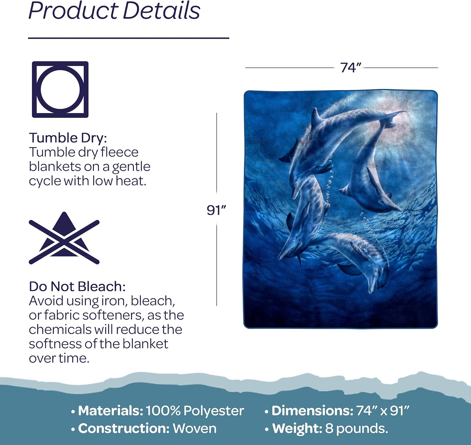 | Included Components | Heavy Fleece Blanket with Ocean Dolphins Pattern- Plush Thick 8 Pound Faux Mink Soft Blanket for Couch Sofa Bed by Bedford Home (74” x 91”) |