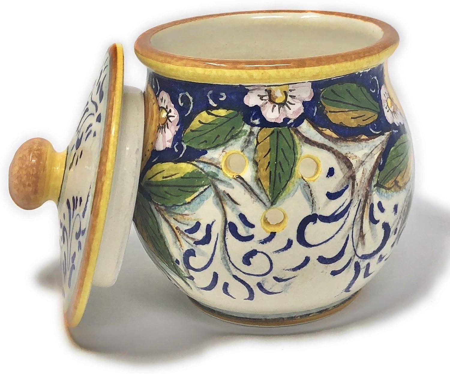 THE TOTAL PRICE INCLUDES CUSTOMS DUTY TAX PRODUCT INFORMATIONCeramic Brings Garlic jar .Decoration:Collection three lemons ; Composition of three lemons , leaves, flowers and curls, on a blue background, yellow/orange borderDimensions: 5,51 inch maximum height at the lid x 4,33 inch x 4,33 inchPRODUCT INSTRUCTIONSAll our products are lead-free and can be used for foods and can wash in the dishwasher