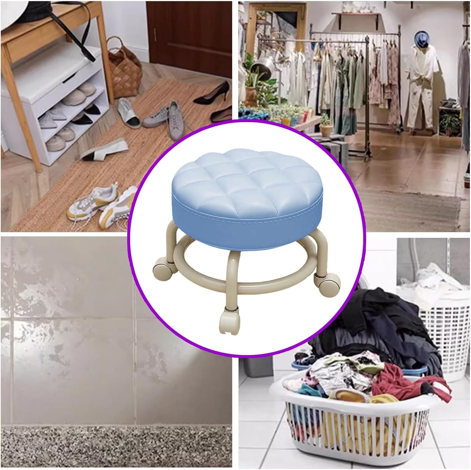 CYQQRDZSW Shop meet this multifunctional 360° swivel caster stool your must have helper for home, office, and makeup scenarios! Whether you need a practical stool for your dressing table or a convenient seat for your office, this 360° swivel caster stool will exceed your expectationsProduct Features:- Sturdy and easy to clean materials- Ergonomic design for spine and knee support- Comfortable and durable seat cushion- Flexible and adaptable for multiple scenariosProduct Specifications:Dimensions: L 11 x W 11 x H 9 inMaterial: PU Leather, Sponge, Iron FrameColors: Black, Blue, Brown, Orange, Purple, WhiteLoad Capacity: 330 lbsApplicable Scenes: home, office, children's room, kitchen, shop, garage room, store and moreNumber of Wheels: 4Package Contents:Rolling Low Stool x 1