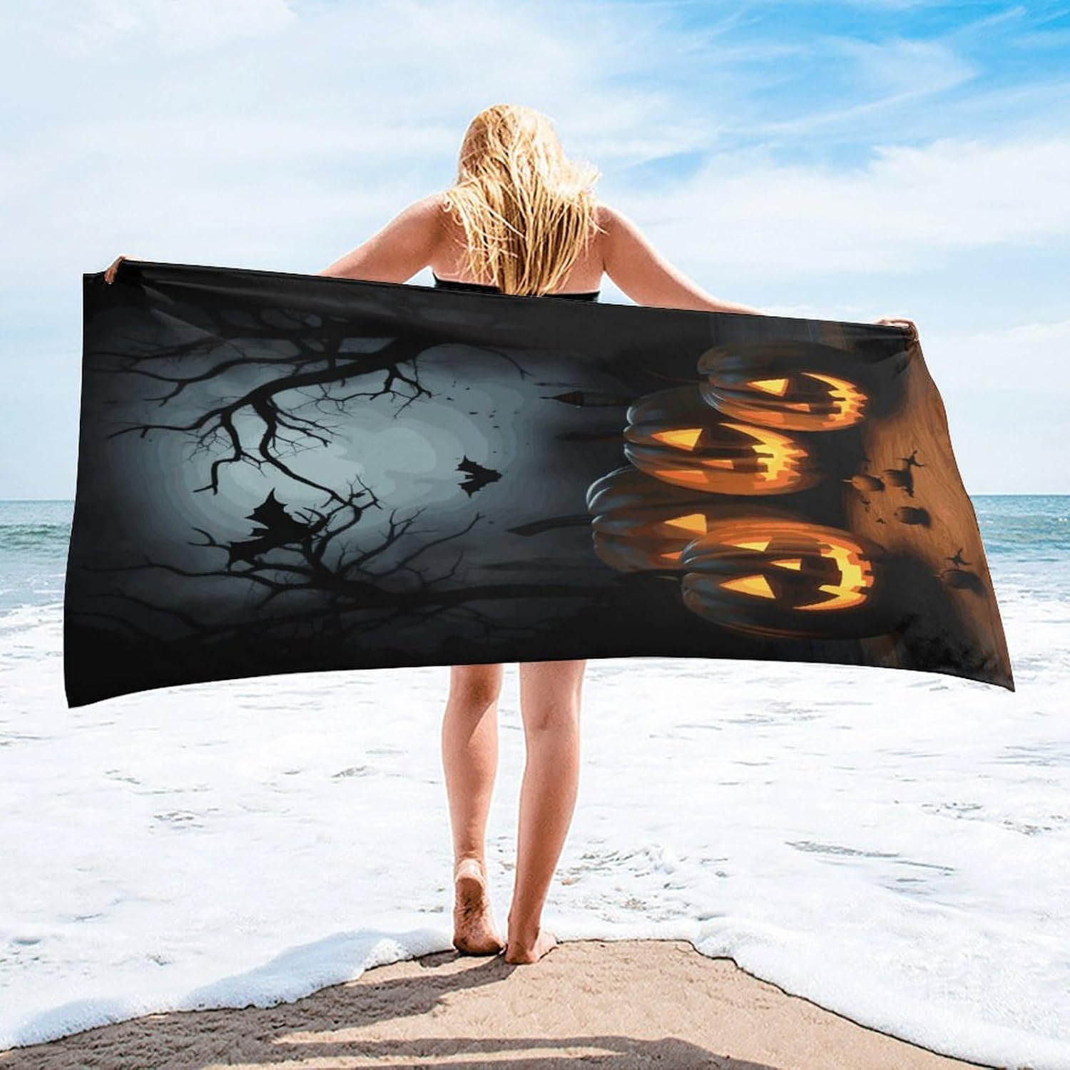 This Halloween with Pumpkins printed quick-drying bath towel is highly absorbent,can quickly absorb body moisture and dry in a short time for next useThis universal bath towel is suitable for the beach,playground beach or any outdoor and indoor activities
