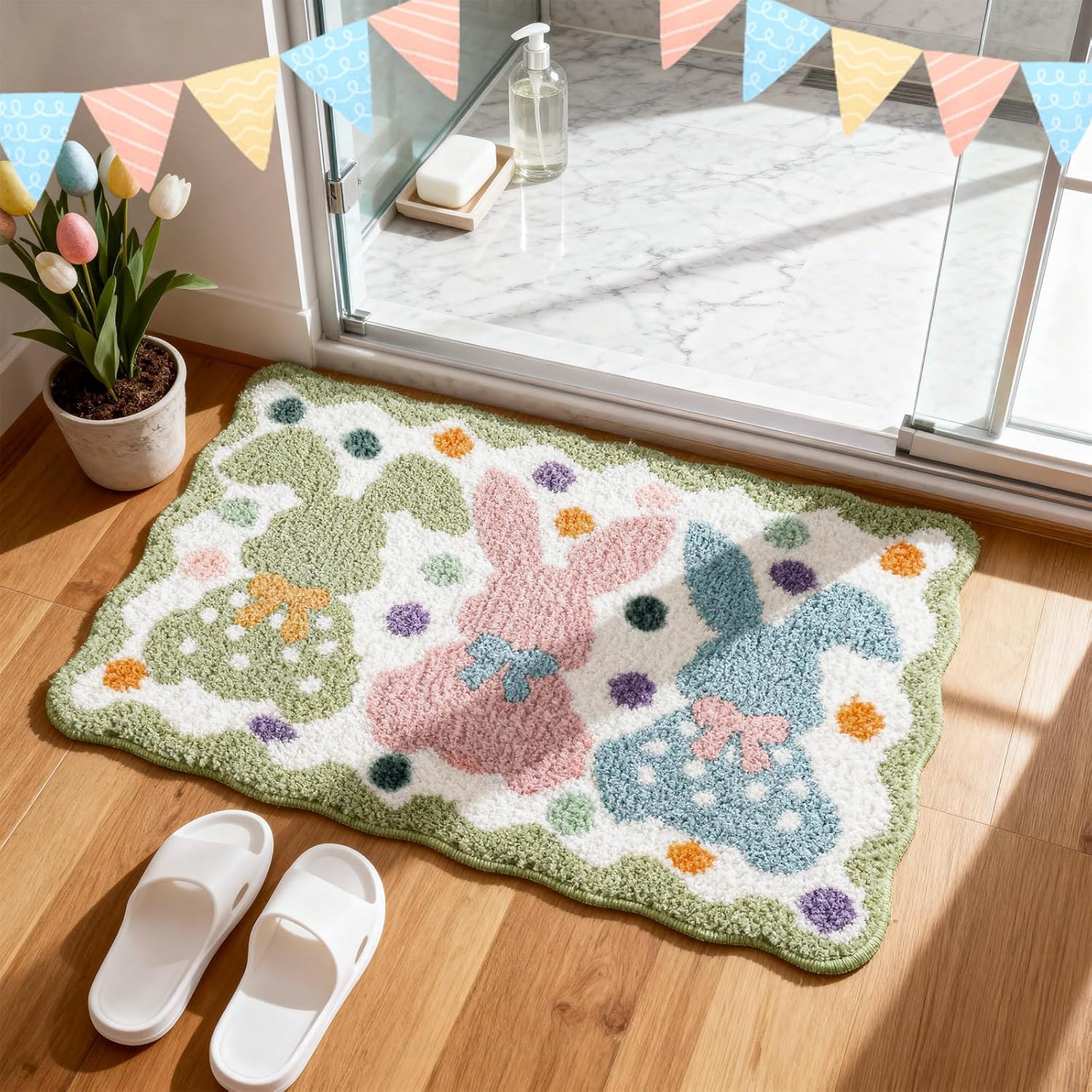 Features: Ideal size: The bath mat is about 16 x 24 inches, which is large enough for your both feet. You can put it at the entrance of the dormitory, bathroom, kitchen, living room, and more. They can bring you a warm and clean environment. Nice water absorption: This Easter bath mat quickly absorbs moisture from your feet, ensuring you never have to worry about slippery surfaces when you step out of the bathroom. It keeps your feet and bathroom floor clean, ensuring your safety. Specifications: Material: microfiber Main color: multicolor Size: 16 x 24 inches/ 41 x 61 cm(WxL) Package includes: 1 x Easter scalloped bathroom rug Notes: Manual measurement, please allow slight errors on size. The color may exist a slight difference due to different screen displays.