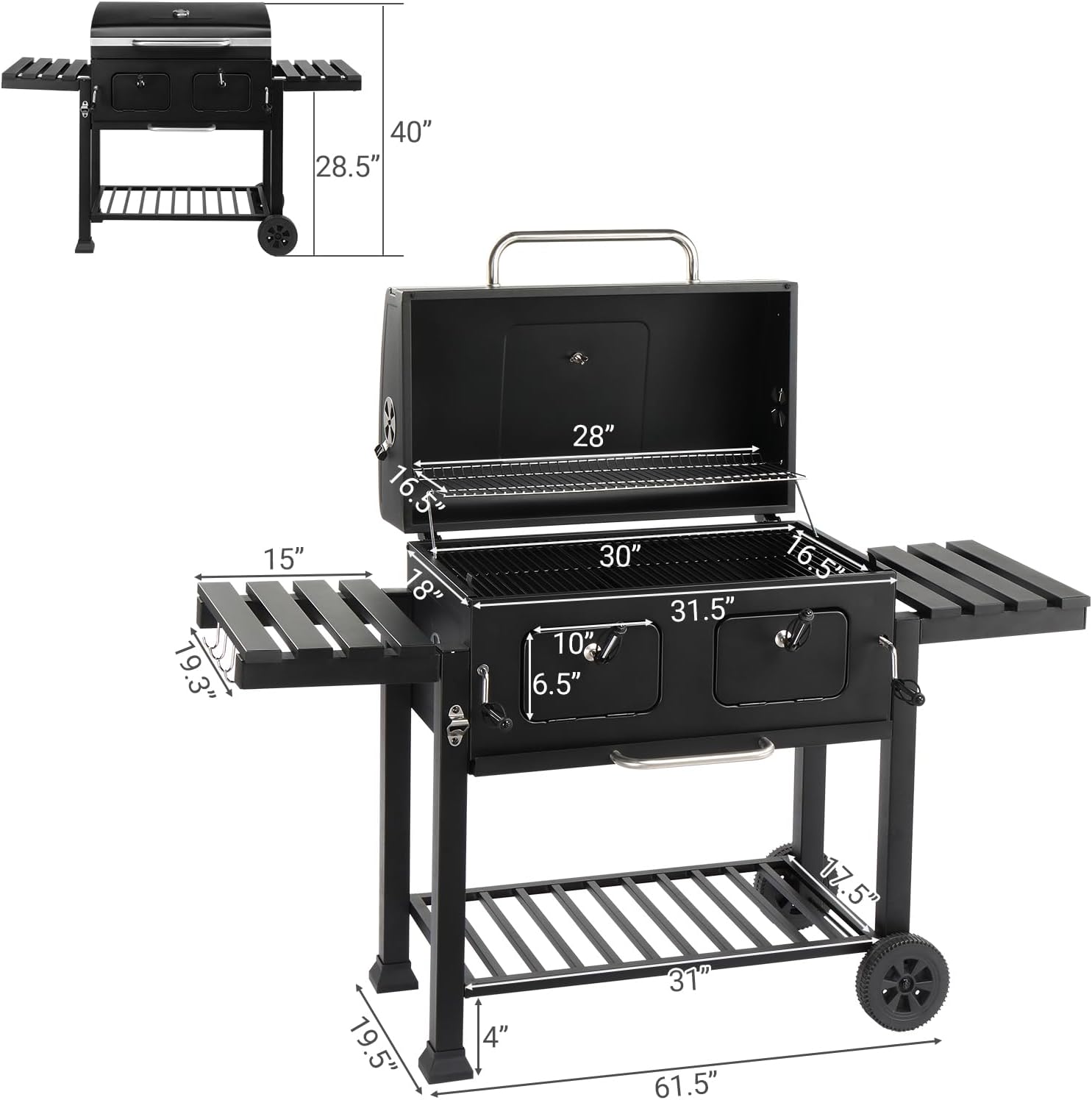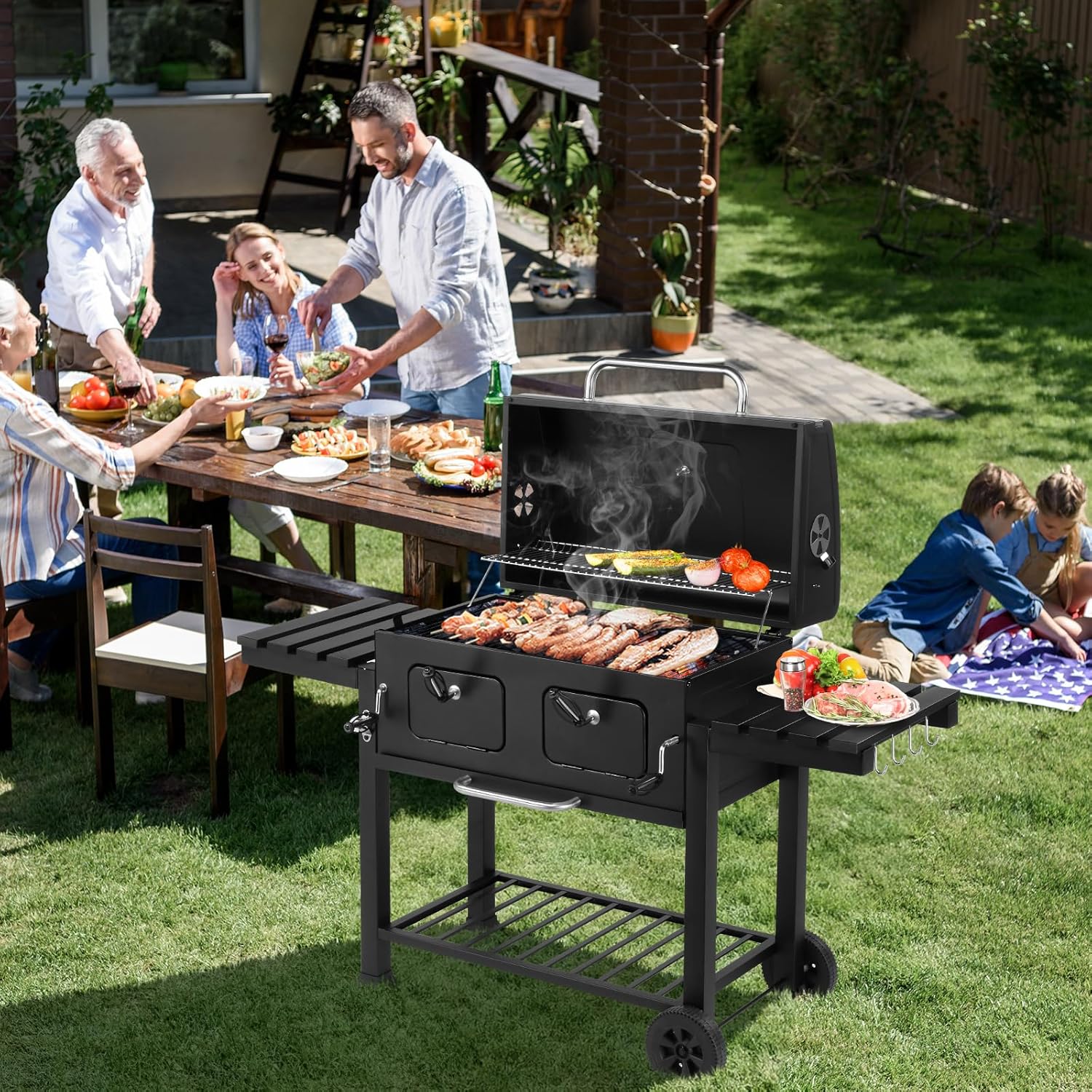 Elevate your outdoor cooking experience with this thoughtfully engineered charcoal grill—designed for versatility, control, and lasting performance. Whether hosting gatherings in the backyard, preparing meals on a weekend camping trip, or enjoying casual cookouts at the park, this grill delivers consistent heat management and generous cooking capacity.The dual independently adjustable charcoal trays let you create distinct temperature zones—ideal for simultaneously searing steaks and gently warming vegetables. Two front-mounted charcoal access doors allow quick fuel replenishment without lifting grates or interrupting cooking flow—enhancing convenience and safety during active use.Foldable side tables provide functional workspace for prep and serving, then tuck away neatly for compact storage or transport. A reinforced bottom shelf offers stable space for charcoal, tools, or accessories. Built from heavy-duty steel with high-temperature powder-coated finish, it resists wear and maintains structural integrity season after season.Engineered for mobility and stability, it features two robust wheels and balanced weight distribution—making repositioning effortless on patios, driveways, or uneven terrain. All components are designed for intuitive assembly and long-term reliability, supporting everyday enjoyment and special-occasion grilling alike.