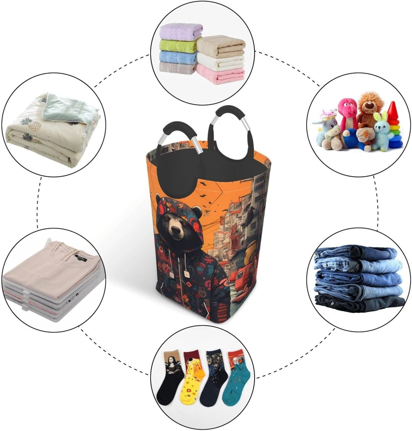 This Fashionable Bear square dirty clothes storage bag is mainly made of polyester, which is light and flexible, and can maintain a stable shape even under heavy pressure and collision. At the same time, the introduction of Oxford cloth material greatly enhances the durability of the product, and it is resistant to wear, bumps and pulling. In terms of design, it adopts advanced leak-proof technology, combined with waterproof coating and precision sewing technology to effectively prevent moisture penetration. The exterior uses cutting-edge transfer technology, and the bottom is supported by PE board to ensure stable load-bearing and does not tip over. Its large-capacity design can easily accommodate winter clothes, daily clothes and sundries, and is easy to carry and store. After folding, it can be tightly placed in the gap of the suitcase. The equipped aluminum handle is sturdy and durable, and supports hanging, which is convenient for placement in various places.