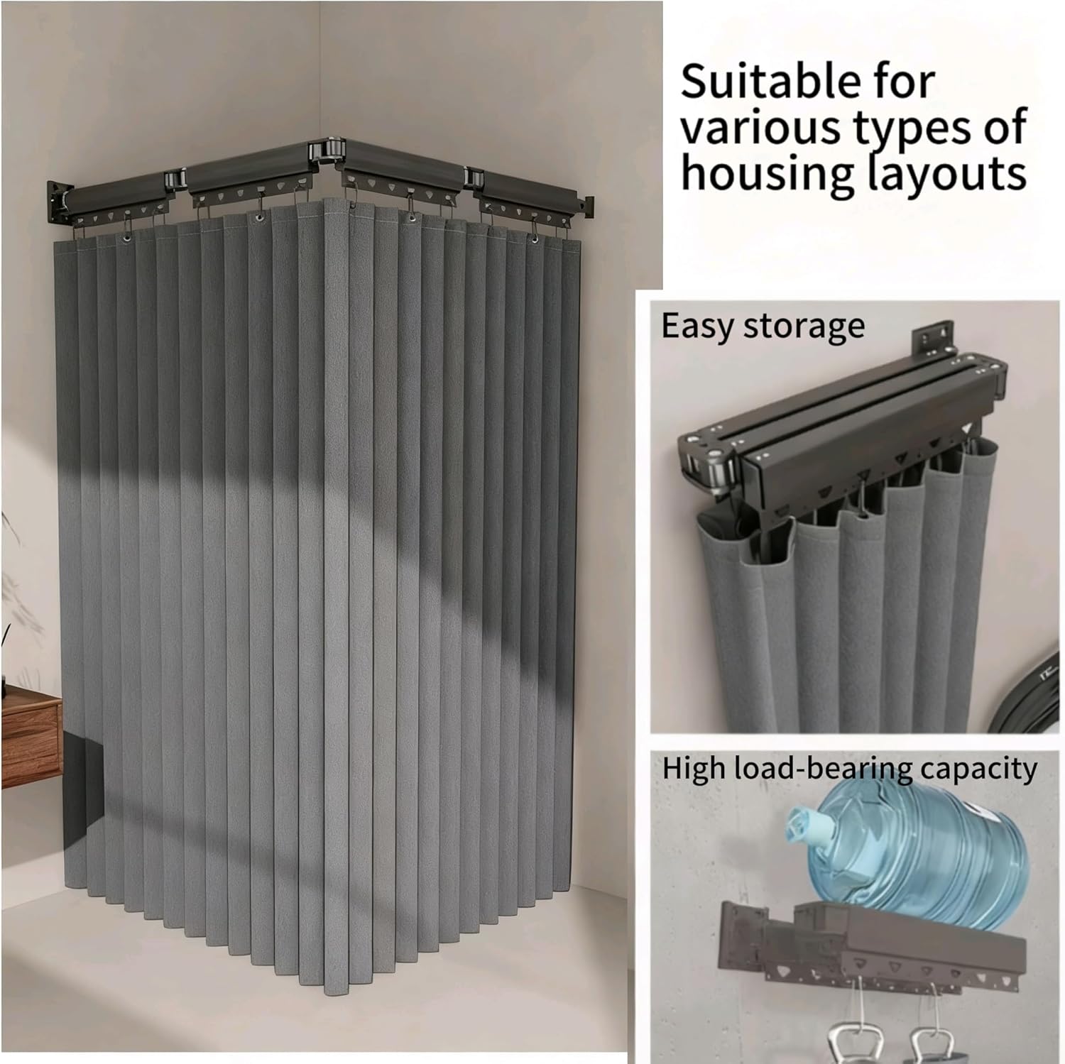 Shower Rod and Curtain Set Water Resistant and tear-resistant fabric,this room divider offers excellent privacy protection in homes,offices. It effectively shields you from unwanted visibility,providing a secluded space when you need it most. Features: - Durable,sturdy material. Strong weight capacity,not easy to bend. - Foldable design for easy storage. - Upgraded Vacuum adsorption,no installation required. - Save space,comfortable and tidy. Specifications: - Name: Adjustable Shower Rod and Curtain Set - Material: Aluminum Alloy + Imitation linen fabric - Color: Gray , White - Load Capacity: 30 kg/66 lbs 2--Fold shower rod: Length: 93cm / 37in, Shower curtain: 100 wide * 200 high cm / 39.4 * 78.7in 3-Fold shower rod: Length: 125cm / 49in, Shower curtain: 150 wide * 200 high cm / 59 * 78.7in 4-Fold shower rod: Length: 159cm / 62.6in, Shower curtain: 180 wide * 200 high cm / 70.9 * 78.7in 5-Fold shower rod: Length: 193cm / 76in, Shower curtain: 200 wide * 200 high cm / 78.7 * 78.7in Packing weight: 2--Fold 1.5kg,3-Fold 1.6kg,4-Fold 1.6kg,5-Fold 1.8kg Fixing Method: There are two ways. For the no-hole installation, free glue nails and auxiliary stickers will be given as a gift, or for the hole installation, screws and wrenches will be provided Package Includes: Folding shower curtain rod*1+Waterproof shower curtain*1 Notes: 1. Please allow 1-3% size difference according,due to the manual measurement,Please make sure you do not mind before you bid. 2. The color may exist a slight differences due to different screen displays. 3. The wall needs to be wiped clean during installation,and the wall seams cannot be installed during installation. It can be used after installation without waiting.
