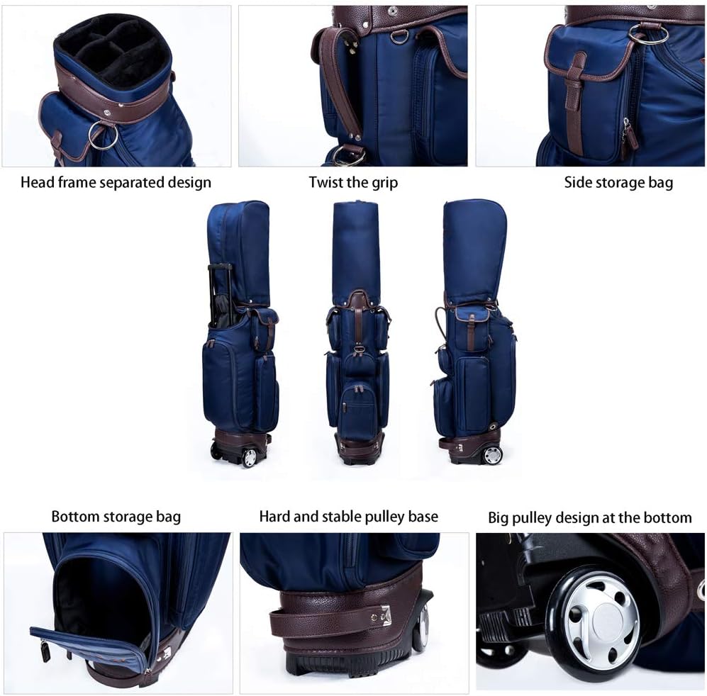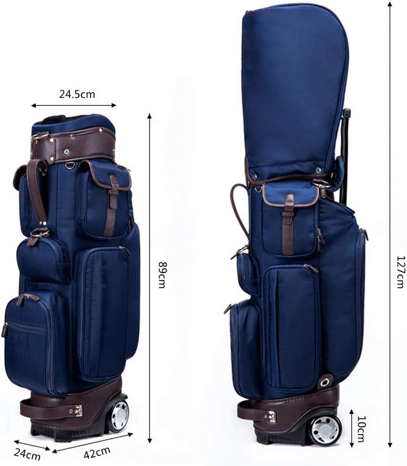 Golf bag club bag | equipment bag | men's standard golf bag | trolley bag with wheelsFeatures:1. Men large tug trolley light golf bagThe separate design of the head frame allows the clubs to be sorted neatly, and the flannel is used to wrap the grid to reduce the frictional damage of the clubs.2. Telescopic rod designTie rod design, easy to carry, press the top button can be freely retractable, can easily pull the bag.3. Twist the gripTwisted hands are meticulously made, comfortable to grip, wear-resistant and not easily broken4. Multiple attached bag designThe side zipper bag can hold small items such as gloves, spikes, golf balls and so on. The bottom storage bag can hold large items such as golf shoes.5. Hard and stable pulley baseOne-piece molding, large tug design, heavy load, easy to pull.Product parameters:Name: Golf bag with pull rod pulley tugspecification:Length: Height 89cm×Width 24cm×Length 42cmHeight with ball cap: 127cmBag weight: 4.18kgSite diameter: 24cmPutting rod hole: 6 gridsBag horizontal length: 42cmBall wheel diameter: 10cmPacking list: 1*golf club bags