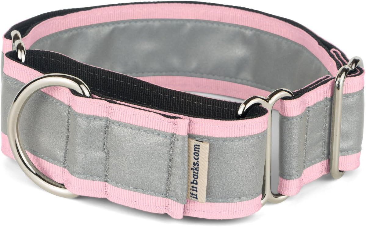 If It Barks reflective martingale dog collars, also known as limited slip collars, are highly recommended by dog trainers over your standard buckle collar or less humane choke chains. Benefits of Martingale Collars: - Dogs with small heads and big necks are not able to back out of the collar like traditional buckle style collars. - Martingales provide better control while walking your dog by applying even pressure around their neck. This reduces injury and choking. - The collar is constructed with two loops of webbing. One wraps around your dog's neck and the other is used to control the amount of closure of the collar when your dog begins to pull. How you adjust the collar determines the allowable closure. Features: - Genuine 3M reflective material for the best night time visibility. - Perfected since 2002, our design uses thin military spec nylon webbing which is approximately half the thickness of others. - The collar is decorated with durable polyester grosgrain ribbon that is easy to clean. - All hardware is durable metal for years of use. - Backed by the If It Barks warranty that if the stitching or hardware fails with regular wear, we'll replace it. - Handmade in North Carolina. - 1.5" inches (3.8 cm) wide in sizes small (11" - 15")(28 - 38cm), medium (15" - 22")(38 - 56cm) and large (19" - 30")(48 - 76cm) Measure Your Dog: Loosely measure the neck where the collar would normally sit sliding two fingers between the dog's neck and measuring tape. Measure the widest part of your dog's head. Order a collar that will fall within the range of these measurements. Care Instructions: If It Barks collars are machine washable. We suggest placing the collar in a pillowcase or lingerie bag to protect metal hardware. Line dry.