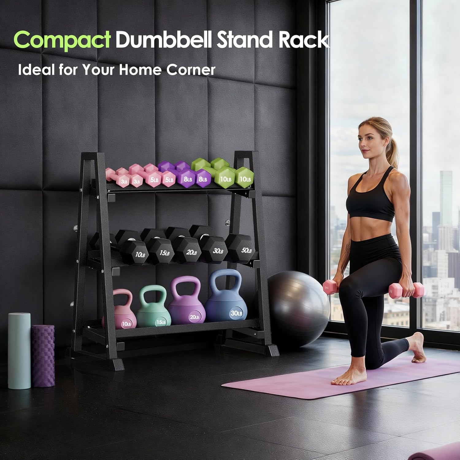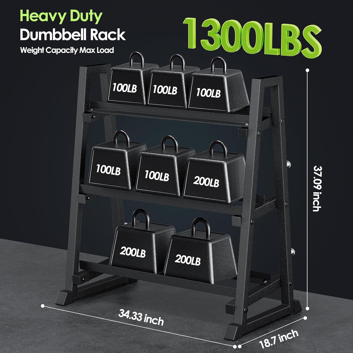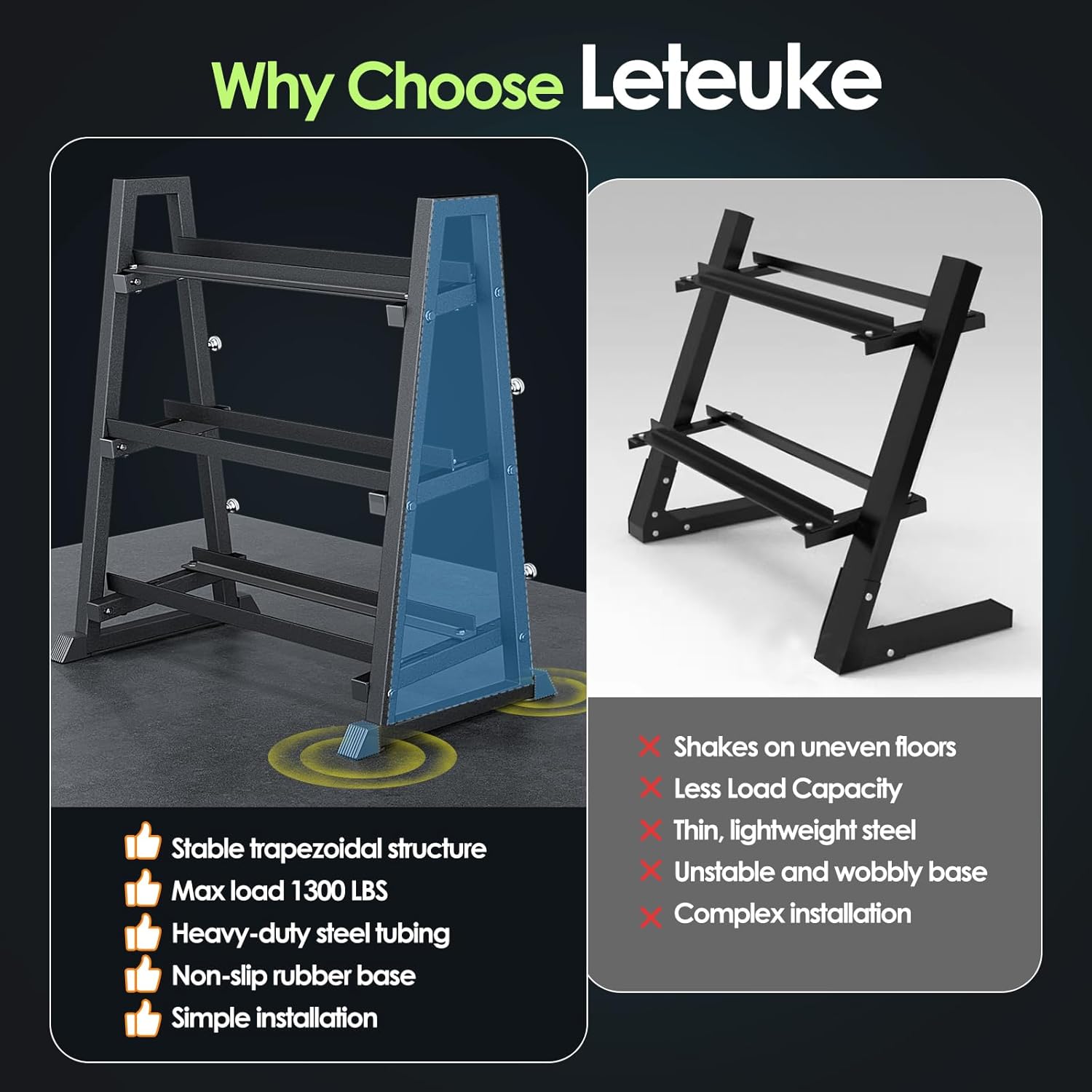 Leteuke Heavy-Duty Dumbbell RackElevate your home gym experience with the Leteuke Heavy-Duty Dumbbell Stand Rack! Featuring a robust trapezoidal base design, this weight storage rack maximizes stability and load distribution. Whether you're engaging in high-intensity training or daily workouts, its reinforced heavy-duty steel construction ensures unwavering support, maintaining wobble-free stability even under extreme conditions to safely hold your entire weight set.With a 1300 lbs maximum load capacity and 3-tier storage system, this rack with adjustable width settings enables secure storage, optimizing space utilization while keeping your equipment neatly organized.The compact footprint design doubles as a multi-functional storage solution for kettlebells, barbells, yoga mats, and resistance bands.Perfect for powerlifters and home gym enthusiasts alike, the Leteuke heavy-duty weight rack transforms clutter into organized efficiency.