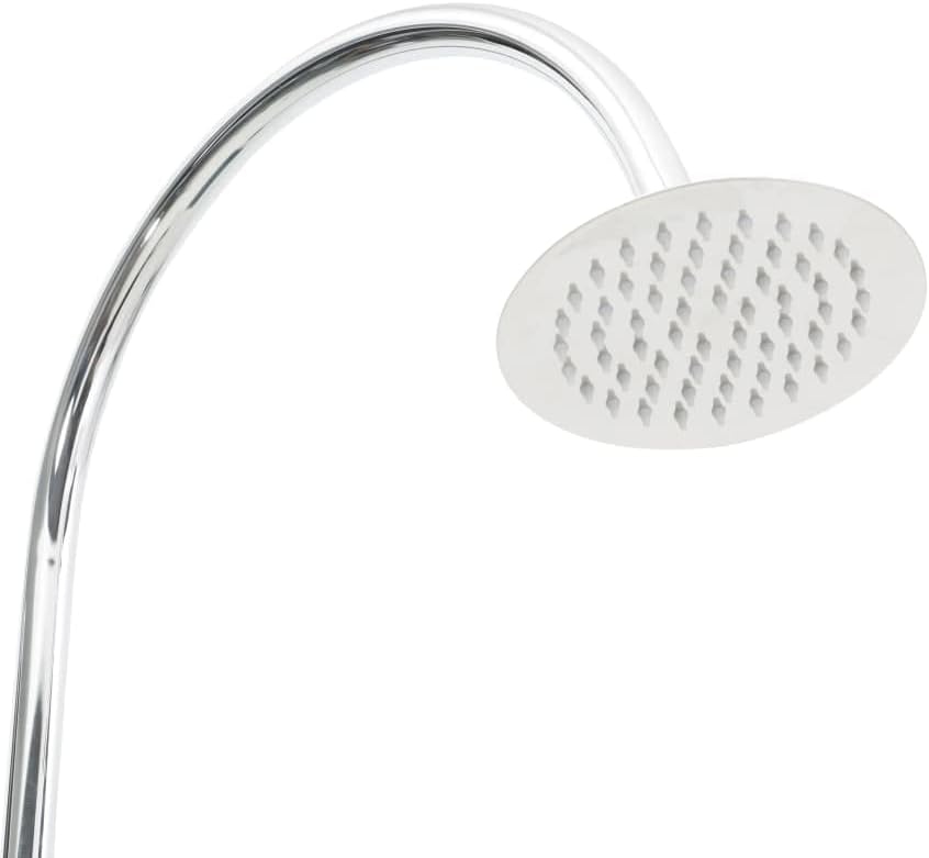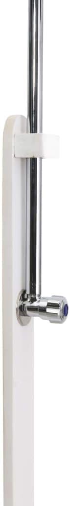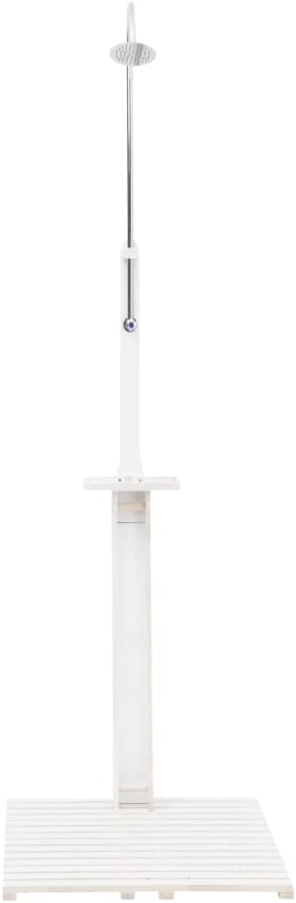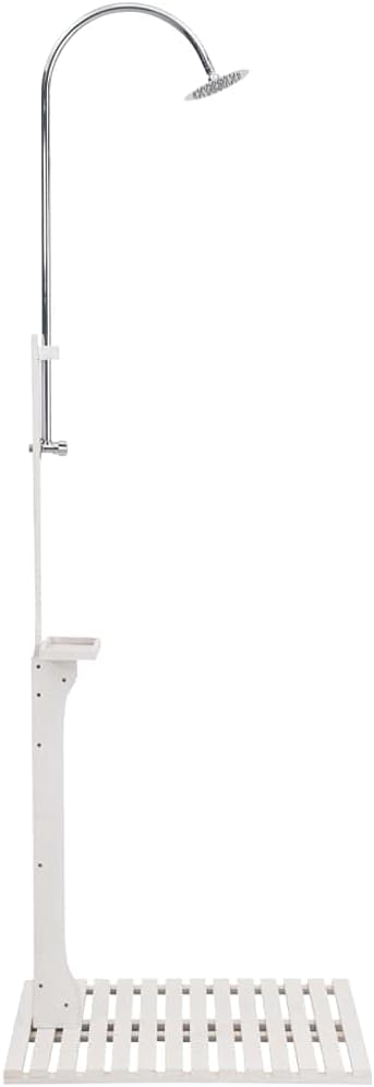 This wooden garden shower is made of hardwood and fir wood, both of which are characterized by absolute weather resistance and durability.Being able to withstand sunlight, rain and frost, the wooden garden shower is ideal to provide cool refreshment in backyard, camping or after outdoor swimming.A rotatable shower nozzle and an adjustable level for water pressure are designed for more convenient use.Color: WhiteBase material: Solid fir wood with oil finishShower head and tube material: Stainless steelKnob material: Chrome-plated copperProduct dimensions: 29.5"x29.5"x87" (L x W x H)Out dia. of water inlet: 1/2 inchShower head height: 78"Shower head diameter: 5.9"Soap tray height: 31.5"Soap tray dimensions: 11.8"x4.7"x1.2" (L x W x H)Base size: 29.5"x29.5" (L x W)Adjustable water pressure