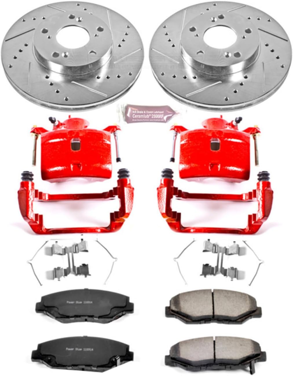 Product: PowerStop Z36 Extreme Truck & Tow Brake Pads & Rotor Kit with Red Powder Coated CalipersWhat’s in the Box: This premium Z36 brake kit upgrade includes Z36 Carbon-Fiber Ceramic Brake Pads, Drilled & Slotted Performance Brake Rotors, Red Powder Coated Calipers, and Stainless-Steel Installation Hardware.Engineered For:Heavy Towing & Hauling – Ideal for campers, work trailers, boats, and medium duty fleetMountain & Severe-Duty Driving – Designed to resist brake fade on long descentsModified Trucks & SUVs – Perfect for lifted suspsension vehicles or larger wheel/tire setupsComponent Breakdown:Z36 Carbon-Fiber Ceramic Brake Pads - Formulated with a low-dust ceramic compound reinforced with carbon fibers for extreme stopping power. Stainless-steel shims help reduce noise and vibration while maintaining everyday drivability.Drilled & Slotted Performance Rotors - Manufactured from G3000 metallurgy and built to strict OE tolerances. Precision-drilled holes and slots vent heat, remove gas and debris, and maintain consistent braking performance under extreme conditions. Silver Zinc Dichromate plating protects against rust and corrosion.Red Powder Coated Calipers - The iconic performance red calipers not only look great behind custom wheels but are easy to clean and resist corrosion, extending the life of the braking system.Easy, Bolt-On Installation: This is a direct-fit replacement designed to install with no modifications required. All necessary hardware is included for a straightforward install using factory mounting locations.This Item Fits:Front: 2002-04 Honda CR-V Front: 2003-11 Honda Element
