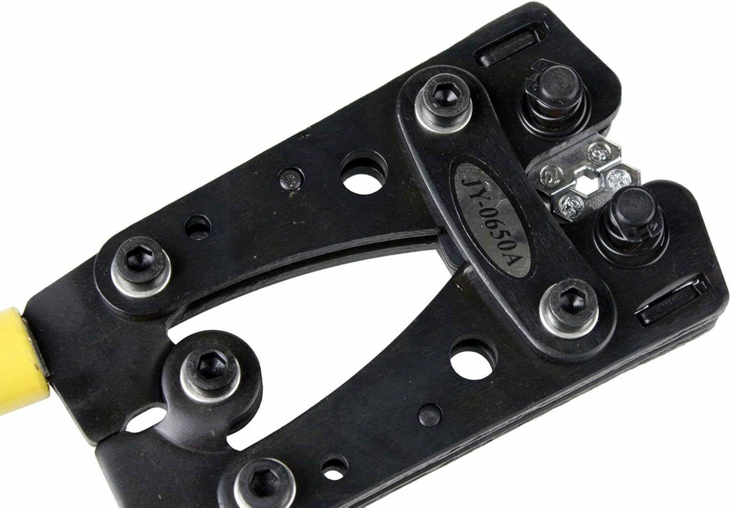 Steel Dragon Tools K05-1GL K-Series Mechanical Crimper Tool for 8 AWG to 1/0 AWG with Rotating DiesThe Steel Dragon Tools K-Series Mechanical Crimper will crimp a variety of small to mid-range copper connectors. The K05-1GL will crimp connectors from 8 AWG to 1/0 AWG, (6 mm²-50 mm²). The K05-1GL features quick-change, rotating hexagonal dies. Specifications: Crimp copper connectors ranging from 8 AWG-1/0 AWG, (6 mm²-50 mm²) Crimping Sizes AWG: 8 AWG, 6 AWG, 4 AWG, 3 AWG, 1 AWG, 1/0 AWG Crimping Sizes mm²: 6 mm², 10 mm², 16 mm², 25 mm², 35 mm², 50 mm² Overall Dimensions: 15-1/2 in. x 3-1/4 in. Overall Weight: 3.3 lbs. (1.5 kg) Features: Hexagonal rotating dies with spring-loaded locking pin. Rubber coated handles to prevent slipping and increases comfort. Easy operation from start to finish. High precision jaw design ensures a tight connection after crimping.