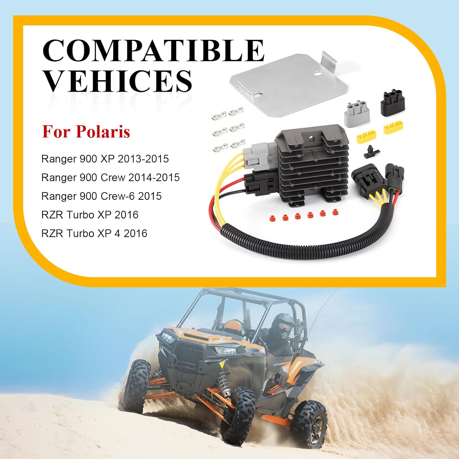 • Compatible Models: Voltage regulator rectifier for Polaris Ranger 900 XP 2013-2015 ,voltage regulator rectifier for Ranger 900 Crew 2014-2015,Ranger 900 Crew-6 2015,voltage regulator rectifier for RZR Turbo XP 2016,RZR Turbo XP 4 2016
